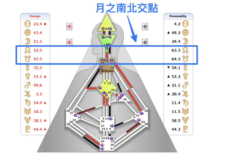 首先拿出自己的人類圖,查詢左右兩邊的「☊ 北交點 」(North Node) 和「 ☋ 南交點 (South Node)」